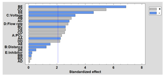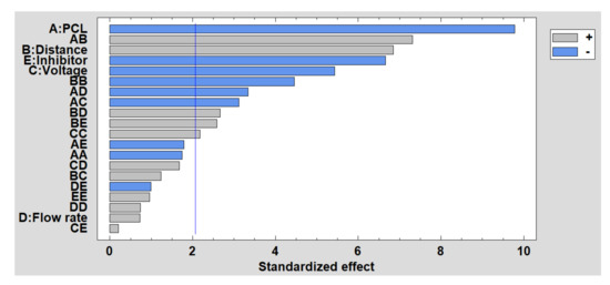In Figure 11 is shown the Pareto diagram for roughness, where the most significant factor is the interaction between distance and the inhibitor. It has been demonstrated that a second porosity thanks to the presence of the inhibitor can induce an increase in the surface roughness, whereas the possibility of obtaining merging fibers with a flattening aspect as a function due to the impact of wet fibers can be produced when the distance is very low to evaporate the solvent. In addition, among the main factors, the most significant is the voltage, so that the higher the voltage, the lower the roughness. However, the opposite effect occurs, as happens with the flow rate and the concentration of PCL. Finally, the estimated surface response of the significant factors in the roughness is presented in Supplementary Materials (see Figure S3).