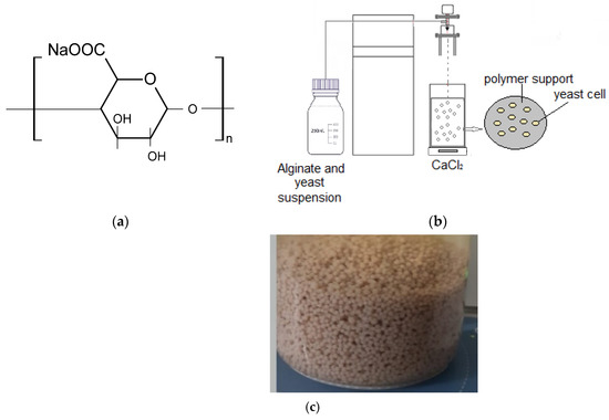 Biomass. Saccharomyces pastorianus are members of the family Saccharomycetaceae. The residual biomass S. pastorianus (an interspecies hybrid of Saccharomyces cerevisiae and Saccharomyces eubayanus [18]) was provided by a local brewing company (Albrau, Onesti, Romania). The residual biomass was separated by centrifugation (8000 rpm), dried at 80 °C and then microencapsulated in sodium alginate (Figure 1a).