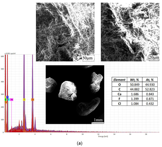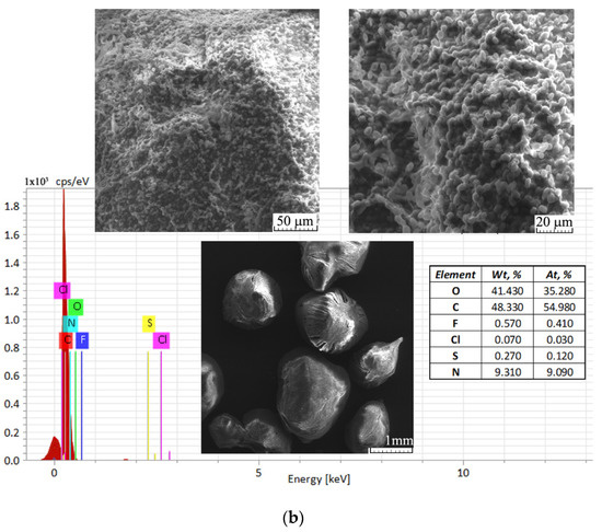 The SEM images presented in Figure 3a easily show the mesoporous appearance of the analysed material. Figure 3b shows the SEM images of the composites after the biosorption process of the Brilliant Red HE-3B dye, showing a slight change in the appearance of the granules’ surface, which became more uniform. Porosity and a large surface area are very important elements in the case of materials used as adsorbents for chemical pollutants.