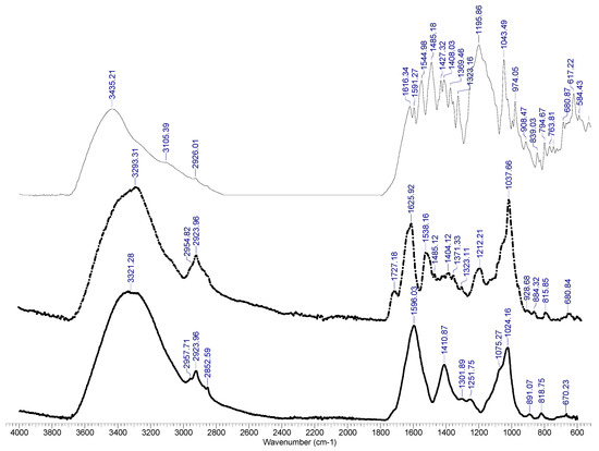(1) Peaks that are present in both types of samples—before and after the biosorption process—are characteristic of the polymer–biomass composite, and come from either the structure of the sodium alginate or from that of the biomass. Characteristic in this regard are the peaks recorded at 3400–3290 cm−1, which are specific for the O–H group, while the sharp peaks at 2950 and 2850 cm−1 can be assigned to C–H stretching; 1050–1125 cm−1 can be assigned to C–O stretching vibrations characteristic of the alcohol structures; 1014 cm−1 can be assigned to CO stretches in the polysaccharides; 1600 cm−1 can be assigned to aromatic ring stretching; and 1400 cm−1 can be assigned to OH bending, which has reduced intensity in samples of biosorbent after biosorption.