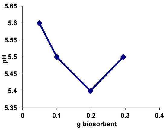 A parameter that allows the appreciation of the electric charge of the biosorbent surface, and therefore its behaviour during interactions with different chemical species—anionic and/cationic—is the point of zero charge (pHPZC). The value of pHPZC (pH of zero charge) for biosorbent based on residual biomass immobilized in sodium alginate was determined using the method proposed by Nouri and Haghseresht, following the graphical representation in Figure 5 [23].
