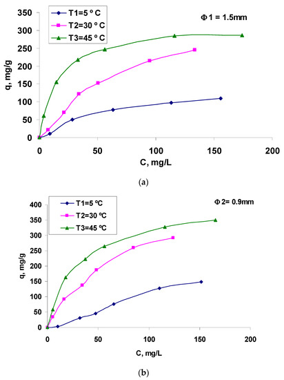 Studying the values of the calculated parameters, an important influence of temperature was observed. The best results for biosorption capacity, q, and the Langmuir constant, KL, were obtained at a temperature of 30 °C. Above this temperature, the values obtained were slightly lower—one explanation being the instability of the microbial biomass, which leads to its denaturation at higher temperatures.