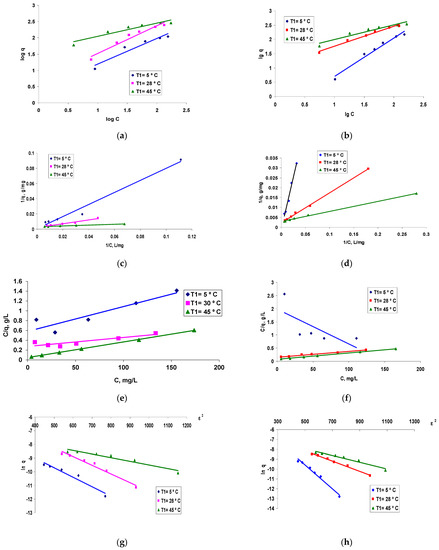 Linearized forms of Freundlich (a,b), Langmuir I (c,d), Langmuir II (e,f) and DR (g,h) plots for the Brilliant Red HE-3B reactive dye on composite material based on residual Saccharomyces pastorianus residual biomass encapsulated in sodium alginate. Conditions: pH = 3, contact time = 24 h, dry substance content in biosorbent = 0.16/0.14 g/L; diameter of granules: Φ1 = 1500 μm (a,c,e,g) and Φ2 = 900 μm (b,d,f,h) at three temperatures: 5°, 30° and 45 °C.