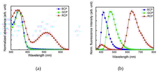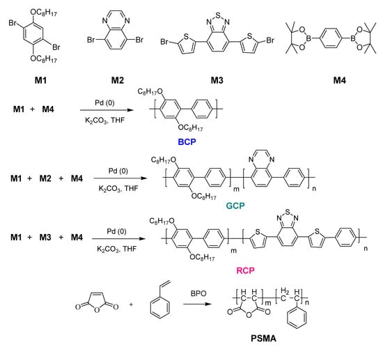 Monomers containing dibromo groups (M1, M2, and M3) were synthesized according to literature methods [33,34,35,36]. BCP, GCP, and RCP were synthesized via the Suzuki coupling reaction in the presence of a Pd catalyst (Scheme 1). PMAS was synthesized by the reaction of styrene and maleic anhydride via conventional radical polymerization with BPO as a radical initiator. The PMAS was used to provide carboxylic acid groups on the Pdot surface, which would be useful for binding to AA. The CPs were soluble in common organic solvents, such as CHCl3, DMF, and THF. The CP chemical structures were confirmed with 1H and 13C NMR and FT-IR spectroscopies, and EA. The molar composition (m:n) of GCP, RCP, and PSMA was determined with EA (Table 1). GPC measurements showed that the number- (Mn) and weight-average MWs (Mw) of the polymers ranged from 8200 to 12,100 and from 10,660 to 45,300, respectively, indicating that RCP had a relatively low MW. The UV-vis and fluorescence spectra of the CPs were investigated in THF solutions (Figure S1). The UV-vis absorption and fluorescence emission of BCP in the THF solution were shown at 350 and 415 nm, respectively. GCP exhibited its UV-vis absorption wavelengths at 350 nm and fluorescence was observed at 415 and 490 nm, where the 490 nm fluorescence was attributed to the quinoxaline group in GCP. Like BCP and GCP, RCP showed an absorption wavelength at 345 nm. The emission wavelengths were found at 415 and 630 nm, because of the presence of the bisthienylbenzothiadiazole (BTB) moiety in RCP. Electron-withdrawing groups such as quinoxaline and BTB played an important role in the red shift of UV-vis absorption, showing the green and red fluorescence, respectively. The solid-state of CP presented very similar results to those in the solution (Figure 1). BCP, GCP, and RCP emitted blue, green, and red fluorescence at 415, 475 nm, and 633 nm, respectively, with an identical excitation wavelength at 350 nm, mainly because of the same UV-vis absorption.