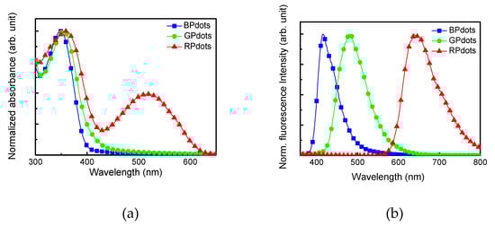 Pdots were prepared via the reprecipitation method [24,37]. During Pdot formation, carboxylic acid groups could be generated from the anhydride moieties present on PMAS (Scheme 2). The Pdots exhibited a UV-vis absorption wavelength around 350 nm, with RPdots showing additional absorbance around 500 nm (Figure 2). The Pdots were uniformly dispersed in an aqueous medium without aggregation, but their UV-vis and fluorescence spectra were similar to those of their solid states.