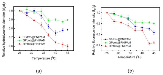 To elucidate the effect of temperature on the volume change of Pdots@PNIPAM, the LCST behavior of Pdots@PNIPAM was investigated via DLS measurements (Figure 4). The hydrodynamic diameters of Pdots@PNIPAM decreased with the increase in temperature, irrespective of the kinds of Pdots, with an abrupt decrease at about 34 °C, which is the LCST of PNIPAM, induced by the PNIPAM shrinking (Scheme S1). The fluorescence intensity of three Pdots@PNIPAM also gradually decreased with an increase in temperature. It was presumed that the shrinkage of PNIPAM polymer chains interrupted the fluorescence emission of Pdots@PNIPAM above LCST. The polymer chain shrinkage resulted in the aggregation of Pdots@PNIAPM, showing an opaque solution. The aggregation and opaqueness were attributed to the fluorescence decrease. The hydrodynamic diameter and fluorescence intensity of Pdots@PNAIPAM could be controlled by temperature in a reversible fashion, in which they showed stable reversibility in the size and fluorescence after several heating and cooling cycles, indicating that Pdots@PNIPAM had thermo reversibility (Figure 5). Because the changes in the hydrodynamic diameter of RPdots@PNIAPM were larger than those of BPdots@PNIAPM and GPdots@PNIPAM, the changes in the fluorescence intensity of RPdots@PNIPAM were more intense. The thermally-controlled fluorescence modulation was observed as highly noticeable for the red fluorescence from in RPdots@PNIAPM (as high as 80%) and the lowest modulation was observed in GPdots@PNIAPM (20%).