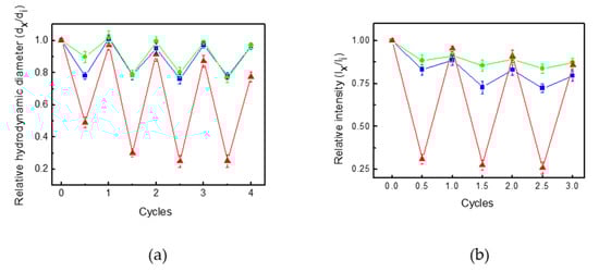 Changes in the (a) hydrodynamic diameters and (b) relative fluorescence intensities (Ix/Ii) of BPdots@PNIPAM (■), GPdots@PNAIPAM (●), and RPdots@PNAIPAM (▲) in aqueous solution over repeated heating (45 °C) and cooling (25 °C) cycles. di and dx correspond to hydrodynamic diameters at 25 °C and at elevated temperatures, respectively. Ii and Ix correspond to fluorescent intensities (at 415 nm for BPdots@PNAIPAM; 475 nm for GPdots@PNAIPAM; 625 nm for RPdots@PNAIPAM) at 25 °C and at elevated temperature, respectively.