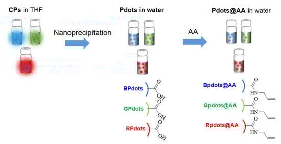 Pdots were derived from conjugated polymers (CPs) and their high fluorescence was inherited from their pristine CPs. In addition, they have various versatile properties, such as uniform dispersion in water and easy surface functionalization [20,21,22,23]. Thus, a number of Pdots with various chemical structures were investigated for their application in chemo- and biosensing [24,25,26,27,28,29,30].