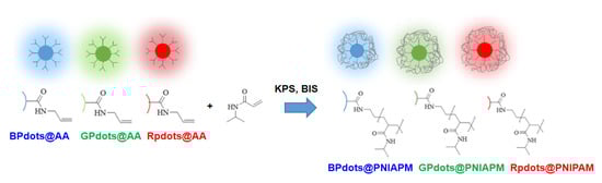 NIPAM, N,N’-methylenebisacrylamide (BIS), and sodium dodecyl sulfate were dissolved in aqueous Pdots@AA solution (5 mL) under argon. The mixture was heated to 70 °C and potassium persulfate (KPS) was added to the mixture for initiation. The mixture was stirred for 4 h and cooled to room temperature. After filtration through a 0.45 μm filter, the mixture was dialyzed for 72 h using a dialysis membrane with 2000 MWCO. The products were denoted as BPdots@PNIPAM, GPdots@PNIPAM, and RPdots@PNIPAM, which were fabricated from BPdots@AA, GPdots@AA, and RPdost@AA, respectively.