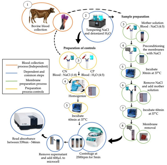 Methodological scheme to determine the hemolysis percentage of the PCL/ChLMW and PCL/ChMMW electrospun biocomposite membranes.