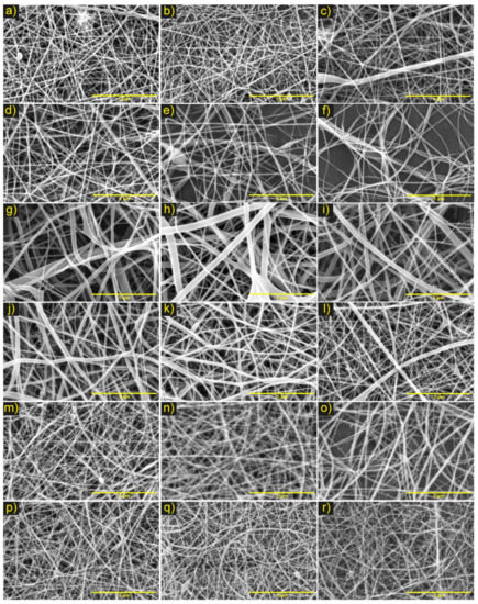 Micrographs of electrospinning PCL/ChLMW membranes under the parameters of the experimental design. Where combination No. 1 (a) 10 cm and 10 kV, (b) 15 cm and 10 kV, (c) 10 cm and 15 kV, (d) 15 cm and 15 kV, (e) 20 cm and 15 kV; combination No. 2 (f) 10 kV and 15 cm, (g) 11 kV and 15 cm; combination No. 3 (h) 11 kV and 10 cm, (i) 11 kV and 20 cm; combination No. 4 (j) (6:4) (PCL: CLMW), (k) (5:5) (PCL: CLMW), (l) (4:6) (PCL: CLMW), (m) (3:7) (PCL: CLMW) and combination No. 5 (n) 0.30 mL/h and 18 cm, (o) 0.30 mL/h and 25 cm, (p) 0.50 mL/h and 18 cm, (q) 0.50 mL/h and 20 cm, and (r) 0.50 mL/h and 25 cm. Scale bar, 5 μm.