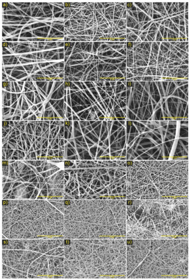 On the other hand, in the combination No. 3 of PCL/ChMMW samples (see Figure 3m–o), changes in the morphology of the fibers were observed as the chitosan concentration increased, which would be related to the change in the apparent viscosity and conductivity of the solutions to be electrospun [31,32]. Likewise, the instability of the Taylor cone influenced the formation of fibers with border irregularities and fiber thickening (see Figure 3m,n). Likewise, there was a decrease in the size of the fibers as the flow and concentration of the chitosan increased (see Figure 3p–s). This variation is due to the molecular composition of the chitosan and the differential of applied potential, which, by presenting positive charges around its chemical structure, favored the increase in conductivity and the stretching of the fibers [33].