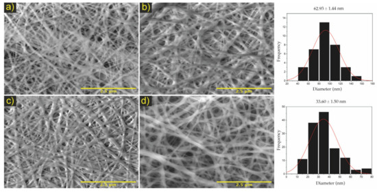 The membranes in Figure 4a,b presented a pore size of 39.2 and 21.9 nm, while Figure 4c,d had a pore area of 22.5 and 19.1 nm (see Table 5). Based on the results obtained, it was found that the apparent pore size is influenced by the synergy between the different electrospinning parameters, especially between the flow rate and the needle–collector distance.