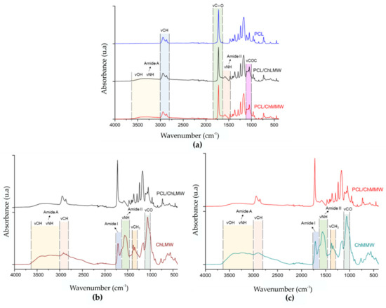 FTIR spectra of electrospinning scaffolds, where (a) control of PCL and PCL/ChLMW and PCL/ChMMW membranes, (b) control of ChLMW and PCL/ChMMW membranes, and (c) control of ChMMW and PCL/ChMMW membranes.