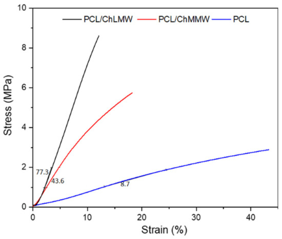 Stress–strain curve of PCL, PCL/ChLMW, and PCL/ChMMW control membranes.