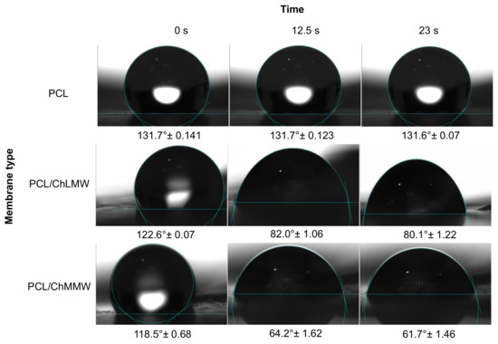 Concerning the contact angle results obtained for the PCL, PCL/ChLMW, and PCL/ChMMW membranes (see Figure 7 and Figure 8), it was found that the PCL has a higher contact angle compared to the other types of membranes, due to the hydrophobic nature of this material, which does not allow the formation of bonding bridges with the molecules of the working solution. On the other hand, it was observed that the presence of chitosan in composite membranes decreases the contact angle, causing them to present a hydrophilic behavior, which is attributed to the presence of groups -OH in the chitosan side chains.