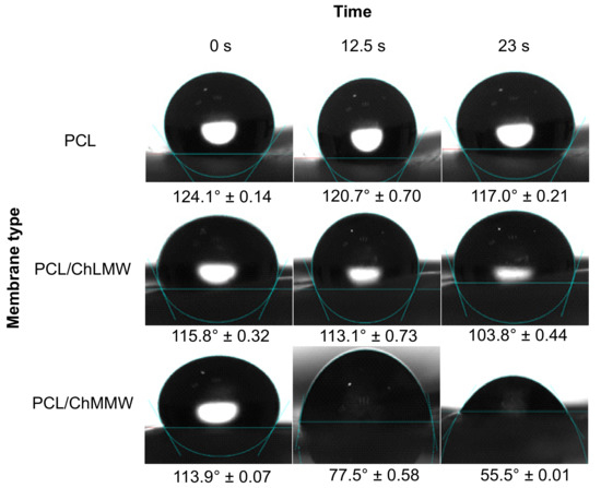 Contact angle for PCL, PCL/ChLMW, and PCL/ChMMW control membranes in interaction with deionized water.