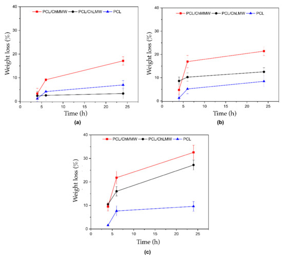 Weight loss versus time for electrospinning membranes of PCL, PCL/ChMMW, and PCL/ChLMW in interaction with (a) basic, (b) neutral, and (c) acids solutions.