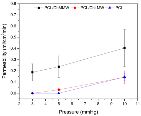 As show in Figure 10, the PCL membrane presented a lower permeability than the PCL/ChLMW and PCL/ChMMW samples, due to larger diameters and cross-linking of fibers, which makes it difficult for the solution to pass and allows its permeability only at one pressure of 10 mmHg. Likewise, it was evidenced that the PCL/ChMMW membranes presented higher permeability than the PCL/ChLMW membranes and with PCL control, because of a greater apparent pore area, fiber diameters, and the presence of —OH groups, attributed to the molecular weight of the chitosan present in the scaffold [35,43].