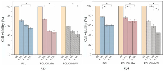 Cell viability of 3T3 fibroblasts upon interaction with PCL, PCL/ChMMW, and PCL/ChLMW membrane leachates, (a) 100% v/v treatment, (b) 50% v/v treatment. * Show the statistical significance of p < 0.05.