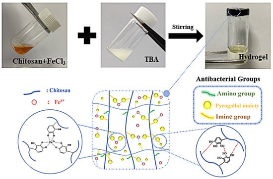 Inspired by the mussels’ outstanding adhesive activity to various substrates in moisture environment, catechol, derived from 3,4-dihydroxyphenylalanine (DOPA), has been incorporated into hydrogels, which usually have good adhesive ability to wet soft tissues []. Similarly, tunicate-inspired wet adhesive hydrogels are prepared based on pyrogallol derived from 3,4,5-trihydroxyphenylalanine (TOPA) [,]. Catechol or pyrogallol modified polymer hydrogels were designed by oxidizing polyphenol groups to form covalent crosslinking, or ion coordination to form ionic crosslinking []. Based on polyphenol chemistry, these hydrogels can connect with tissues or other materials by coordination bonds, covalent bonds, hydrogen bonds, π–π, cation–π, and other forces formed []. Recently, many mussel-inspired hydrogels have been reported; however, tunicate-inspired hydrogel with multifunctional properties are still rare. Pyrogallol contains more hydroxyl groups than catechol, which is expected to form hydrogels with excellent underwater adhesion and the self-healing ability [,]. Therefore, it is necessary to construct a tunicate-inspired chitosan-based hydrogel with multifunctional properties include robust wet adhesive ability, antibacterial activity and self-healing property.