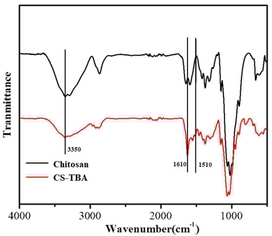 The Fourier transform infrared (FT-IR) spectra of chitosan and CS-TBA were recorded on an FT-IR spectrometer (Nicolet 6700, Thermo Nicolet Corporation., Madison, WI, USA).