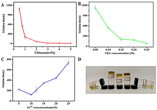 Gelation time of CS-TBA-Fe hydrogels varies with concentration of chitosan (A), TBA (B), and Fe3+ (C), and the photos of the mixtures of chitosan and TBA without Fe3+ (D).