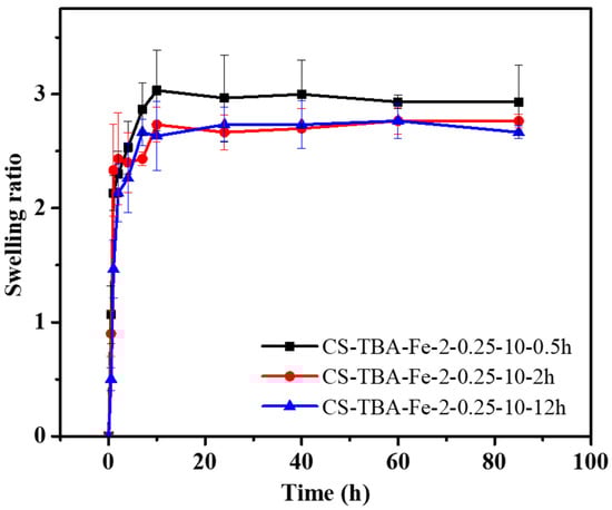 The swelling capacity is a general feature of the hydrogel that reflects polymer construction, the degree of crosslinking within the hydrogel and the interaction between hydrogel polymer and aqueous solutions. In this paper, the swelling degree can reflect the stability of CS-TBA-Fe hydrogels formed by dual crosslinking interactions of pyrogallol oxidation and Fe3+ coordination. The swelling capacities of the CS-TBA-Fe hydrogels were investigated by calculating the weight change from the initial dry gels to the wet gels under 1% acetic acid solution at 37 °C during the specific time intervals. As shown in Figure 4, the swelling rate of the CS-TBA-Fe hydrogels increased rapidly in the first 2 h. Then, the hydrogels reached the swelling equilibrium in about 7 h, and they had no obvious disintegration even for 85 h. Therefore, CS-TBA-Fe hydrogels can maintain good cross-linking stability in aqueous environment for a long time.