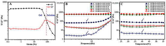 Linear viscoelastic region of CS-TBA-Fe hydrogels (A), and the frequency sweep (B) and temperature sweep (C) tests with different curing time.