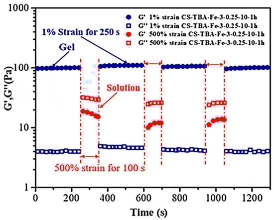 The alternate step strain sweep between 500% and 1% at the same frequency (1 Hz) was performed to assess the strain-induced damage and self-healing ability of the CS-TBA-Fe hydrogel (Figure 6). The time sweep test was first carried out at 1% strain to ensure that the sample was fully cross-linked. Then, a 500% strain was suddenly applied, and the G’ of the sample dropped from 105 Pa to 15 Pa and below G’’, indicating a complete disruption of the cross-linked state. Interestingly, once returned to a 1% strain, G’ immediately returned to the initial state. The disruption and recovery process of the CS-TBA-Fe hydrogel could be repeated alternately several times. The self-healing ability of CS-TBA-Fe hydrogels is stabler than CHI-C/DACNC hydrogels prepared by catechol-conjugated chitosan (CHI-C) and dialdehyde cellulose nanocrystal (DACNC) which can only recycle twice under the alternate step strain sweep []. The results indicated that the CS-TBA-Fe hydrogel had a fast and efficient self-healing ability.
