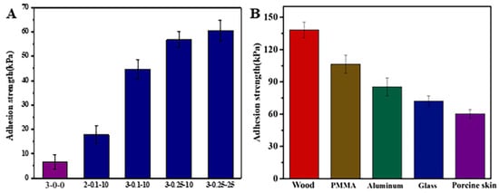 Adhesion strength of CS-TBA-Fe hydrogels with different structures on porcine skin (A) and comparison of the adhesion strengths in bonding various substrates (B).