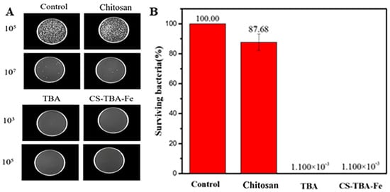 Digital images of surviving bacteria on chitosan, TBA, and CS-TBA-Fe (A) samples after being co-cultured with E. coli (A) and comparison of bactericidal activity of chitosan, TBA, and CS-TBA-Fe against E. coli (B).