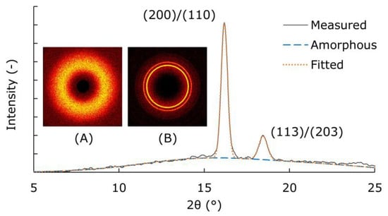 The crystal structure of the PLA was analyzed by wide-angle X-ray diffraction (WAXD) using Rigaku (Tokyo, Japan) Smart Lab. The measurement conditions were as follows: X-ray, Cu (Kα); camera length, 28.5 mm; exposure time, 10 min; and the detector was a HyPix-3000. Three samples were sandwiched between the Kapton tapes (3M Japan, Tokyo, Japan) for measurement. From the measured 2D image, the background including Kapton tape was corrected using SmartLab Studio II software (Rigaku, Tokyo, Japan). Figure 1 shows how the crystallinity was calculated using Igor Pro 6.0 software (WaveMetrics, Portland, OR, USA). The integral value of the amorphous halo (A) in the azimuth direction was fitted by a Gaussian function to obtain an amorphous 1D profile. From the 1D profile of the semi-crystalline sample (B), the crystal planes (200) (110) and (113) (203) were fitted by a Gaussian function to obtain the area ratio of crystals to an amorphous halo.