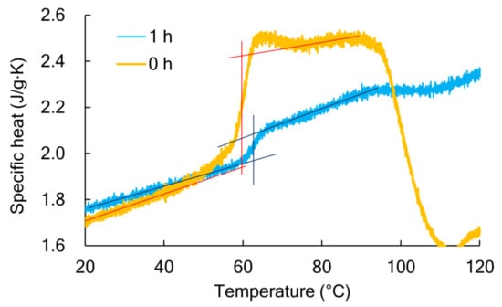 Comparison of specific heat between the amorphous PLA (0 h) and annealed PLA at 70 °C and 95% RH (1 h).