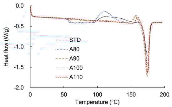 Annealing PLA changes not only the crystallinity but also the polymorphism. A DSC curve measured in a heating process included the information of rigid amorphous, α-form crystals, and α’-form crystals. In Figure 3, the STD and A80 showed a Tg around 60 °C, and the heat of cold crystallization (Tcc) around 120 °C. The peak of Tcc was apparently shifted to a lower temperature by annealing []. For A90, A100, and A110, a transition from α’-form to α-form crystal appeared at around 160 °C instead of the Tcc [,]. Thus, the amorphous molecular chains changed to an α’-form crystal during annealing at less than 110 °C under reduced pressure.