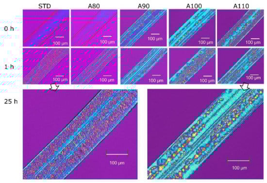 Annealed PLA specimens were placed in a chamber at 70 °C and 95% RH for a specific length of time. Then, changes in the crystal structure were measured with POM and DSC. Figure 4 shows the POM micrographs of the cross-section of the specimens after a predetermined time had passed. Specimens at 0 h, which meant initially annealed, changed significantly depending on whether the annealing temperature was 80 °C or less or 90 °C or more. Birefringence was observed in the cross-section of the STD; the molecular chains were in-plane oriented despite the amorphous scattering by WAXD. The annealed specimens A90, A100, and A110 showed oriented crystals and spherulites. This corresponded to the crystallinity shown in Table 1.