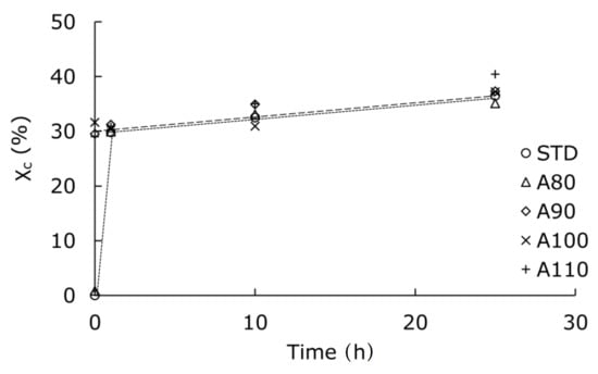 The hydrolysis of PLA often proceeds at temperatures below its Tg in the natural environment. In contrast, accelerated degradation at a high temperature and humidity is generally performed in the laboratory. In researching the relationship between the crystal structure of molded PLA products and their hydrolysis, there was concern that the difference in crystal structure between the initial specimens would be lost during the accelerated test. In this experiment as well, the amorphous PLA reached a crystallinity of 30% within 1 h at 70 °C and 95% RH—that is, the difference in crystallinity of the initially annealed specimens disappeared. However, as shown in Figure 9, the initial crystal structure greatly affected the decrease in MW.