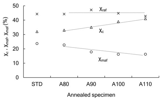 The index of higher-order structure includes not only crystallinity but also rigid amorphous. Although the crystallinity measured using DSC was the same in the specimens set for 1 h at 70 °C and 95% RH, the detailed structures were analyzed again. The WAXD analysis was added, and we attempted to separate the amorphous sections into mobile amorphous (χmaf) and rigid amorphous (χraf) groups using the gap in specific heat change at Tg. Figure 7 shows the ratio of χc χmaf χraf for each specimen. The comparison of the STD to the A110 suggested that the initial annealing increased χc and decreased χmaf. There was little change in χraf. Thus, we focused on the amount of χmaf. As shown in Figure 8, strain at break increased when χmaf was 17% or more. Since the tensile test was performed at a room temperature lower than Tg, the amount of χmaf, which indicated higher molecular mobility, affected the elongation of specimens.