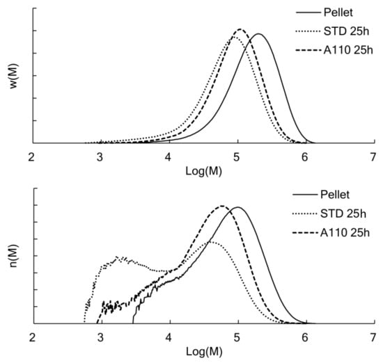 As described above, each specimen had comparable crystallinity except during the first hour. We examined whether the initial crystal structure affected hydrolysis for the remaining 24 h. Figure 9 shows the changes in the molecular weight distribution (MWD) of PLA due to hydrolysis. The MWD of PLA after the 25 h test was compared to that of raw pellets with no processing history as a reference. The Mn decreased from 217 kDa in Pellet to 98.1 kDa in STD 25 h and 122 kDa in A110 25 h. The polydispersity was 2.2, 3.1, and 2.2, respectively. The difference in the polydispersity was that the MW peak of A110 25 h shifted toward a lower MW, as shown in both curves of weight fraction w(M) and mole fraction n(M). On the other hand, in STD 25 h, the low-molecular-weight component increased remarkably.
