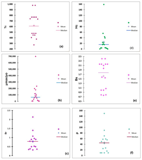 To analyze the qualitative data of soft magnetic materials (given in Table 1), XLSTAT and Origin software were employed after the process of data as reported in the literature [21]. The descriptive picture of important physical characteristics of soft magnetic materials, i.e., Tc, μmax/μo, Br, Hc, Bs, ρ, is given in Figure 1. It can be seen from the figure that dispersion of data for each characteristic is high, and it is very hard to select any material for a specific application while relying either on mean value or total variance. Coefficients of variance (CV), which are equal to the ratio of standard deviation to mean, is calculated and shown in Table 2. The mean and median values of each physical characteristic are also presented for comparison purpose. The overlapped mean and median values and smaller values of CV of some magnetic properties, i.e., Tc, Br and Bs for enlisted materials (see Table 1 and Table 2 and Figure 1) reveal that these parameters are less important when application relevancy of soft magnetic materials is considered.
