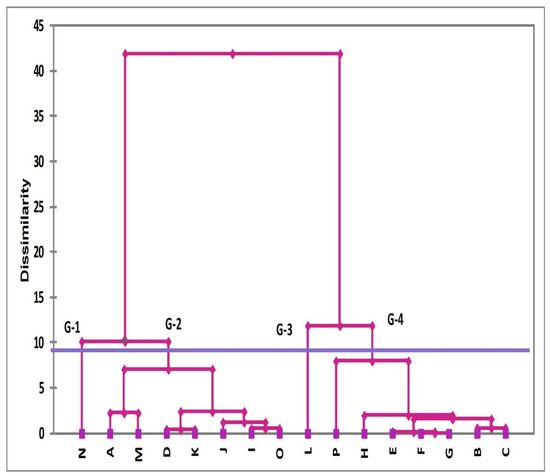 For further visualization, Cluster analysis (CA) is performed, and results are presented as a dendrogram based on the dissimilarities in properties of enlisted soft magnetic materials. Based on dissimilarities, soft magnetic materials are grouped into four clusters as shown in Figure 2. CA grouped the materials into four clusters, which are labeled as Group 1, 2, 3 and 4. These groups correspond to relatively excellent, good, fair, and bad attributes for soft magnetic materials, respectively. It is evident from the dendrogram shown in Figure 2, that the soft magnetic material Supermalloy, Magnifer 7904 labeled as “N” form G-1 is the best group on the relative scale. The second group consists of seven materials that form the cluster of good magnetic materials and labeled as G-2. The order hierarchy of seven members of this group on relative scale is . Group 3 of fair materials G-3 has only one material, Permendur 2V labeled as “L”. The poor group is G-4, and it contains seven materials with following hierarchy order on the relative scale. The priority wise ranking of physical characteristics that is obtained from the descriptive analysis (see Table 3) is used to explain the arrangement of the materials in each cluster, as well as arrangement of the materials within the groups on relative scales. The best material label “N” has a lower value of coercive magnetic field (Hc), and a higher value of relative permeability (μmax/μo), thus making G-1 the best. The average values of physical characteristics of all materials in G-2 (except relative permeability) are significantly lower when compared to members present in G-1. However, the values are higher than the members of G-3 and G-4, thus making G-2 good. The materials in G-3 and G-4 are marked as fair and poor on the basis of electrical resistivity (ρ). The value of electrical resistivity ρ for the standalone material in G-3 is lower when compared to the average value of ρ of the G-4 cluster. The electrical resistivity is intrinsic in nature and has no significant correlation with other magnetic properties (as explained in next section) thus playing a significant role in classifications.