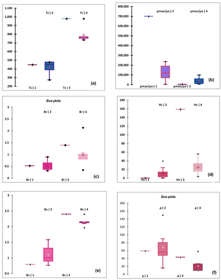 Box plots of (a) Tc; (b) μmax/μo; (c) Hc; (d) Br; (e) Bs; (f) ρ, for four clusters based on dendrogram.