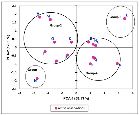 The characteristic loadings for enlisted soft magnetic materials on the first two principal axis are represented in Figure 4. Groups with standalone magnetic materials, i.e., G-1 and G-3, have strong negative loadings and strong positive loadings on PC-1 and PC-2, respectively. This is true as far as physics of magnetic characteristic is concerned because the lowest value of Hc and the highest values of μmax/μo are required for the best alternative. The higher value of μmax/μo, lower value of Hc and the moderate positive loading of resistivity ρ (as evident from Table 5) are the major reasons for placing the material with label N in third quadrant (see Figure 4). The materials that form group 2 in the cluster analysis show weak to moderate negative loadings on PC-1, and this is true for all materials belonging to this group as far as loadings on PC-1 are concerned (see Figure 4 for detail). In addition to this, the materials which have strong negative loadings on PC-1 also have strong positive loadings on PC-2 which is confirmation of the agreement of PCA results with cluster analysis outcomes. The classification of enlisted materials into excellent, good, fair, poor groups and prioritization ordering of materials on a relative scale, i.e., , is also confirmed by PCA. The hieratic order of A, M, I, O is clear as A and M have strong negative and positive loadings on PC-1 and PC-2, respectively. The materials labelled as I and O have moderate negative loadings on PC-1 and weak loadings on PC-2. The complete picture of prioritization order is clearer while looking at the bipolar chart given in Figure 5. Group 3 consists of only one material labeled as L and has strong positive loadings on PC-1 and PC-2, respectively. The strong positive loadings on PC-1 means this group has the lowest Hc which is the most important characteristic in the list, thus labelling this group as fair. Group 4 (except material labeled as P) has weak to moderate positive loading on PC-1. In addition to this, it has weak loadings (positive and/or negative) on PC-2, thus labelling it as poor. The prioritization order on the relative scale is also evident from Figure 4 and in agreement with the findings of the cluster analysis, i.e., .