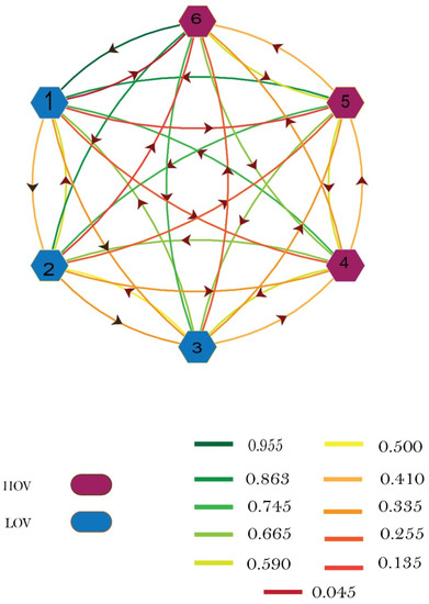 The material assessment graph as shown in Figure 7 is plotted using Mathematical software by considering six different material selection factors. As there are six material selection factors, there are six corresponding nodes labeled as 1, 2, 3, 4, 5, and 6, respectively. The graph displays the arrow from node 1 to 2 and likewise from 2 to 1, the color of each arrow represents the relative importance of one parameter to another. Furthermore, higher obligatory value (HOV) and lower values obligatory value (LOV) attributes are also represented with colors (see Figure 7). Maximum relative permeability is more important than Curie temperature in the process of material selection, but Curie temperature is also important, though less important than maximum relative magnetic permeability, so in both cases, relative importance is present between the two attributes. Similarly, interrelation is present between other factors. However, this graph is only a visual representation of material selection factors and their relative importance. For analysis, an adjacency matrix of the graph is written, which is then used for figuring out the material suitability index for each enlisted material.