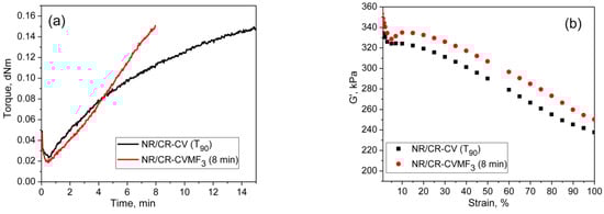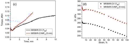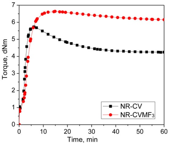 Represented in Figure 2 are the curing curves of NR-CV and NR-CVMF3 at 170 °C for 1 h. Their cure characteristics are displayed in Table 2. NR-CV attains a maximum torque in 6.13 min and then exhibits a sharp declination in the rheometric torque with time due to reversion. The reversion was calculated and reported in percentage using Equation (4) and the values are depicted in Table 3.