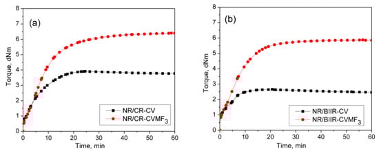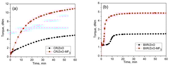 It is well-known that halogenated elastomers such as CR and BIIR can be cured with metal oxides. Represented in Figure 3a,b are the curing behaviors of CR and BIIR as per the formulations given in the mixes 3–6. Their cure characteristics are displayed in Table 2.