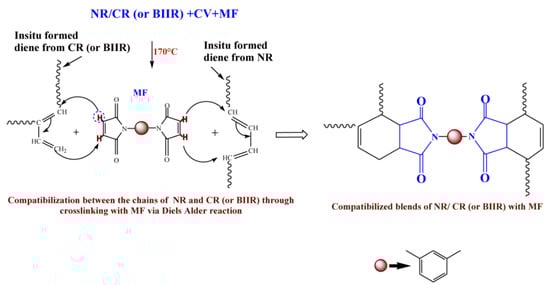 Plausible mechanism proposed for the compatibilisation (co-curing) effect of MF between NR and CR (BIIR) via Diels–Alder reaction.