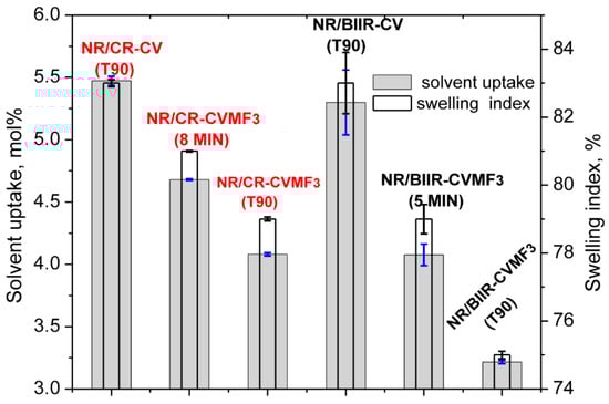 It can be seen that the solvent uptake and the swelling index of the blend NR/CR-CV cured at its T90 was considerably higher than the corresponding NR/CR-CVMF3 cured at its T90. This swelling behavior is quite expected because the ΔM value of the T90 cured NR/CR-CV was around 44% lower than the T90 cured NR/CR-CVMF3. In general, the lower the ΔM value, the lower will be the crosslink density and, hence, the higher will be the solvent uptake and swelling index. However, it is interesting to note that the solvent uptake and the swelling index of NR/CR-CVMF3 cured up to 8 min was also lower than the T90 cured NR/CR-CV even though the ΔM produced in NR/CR-CVMF3 after 8 min of curing and the ΔM of NR/CR-CV cured up to its T90 exhibit almost the same value of around 3.0 dNm (Figure 2). Similarly, the solvent uptake of the T90 (10 min) cured NR/BIIR-CV was around 23 mol% higher than the 5 min cured NR/BIIR-CVMF3 even if both these blends cured up to the specified time exhibited the same ΔM of around 1.6 dNm.