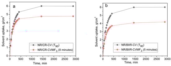 The solvent uptake of (a) T90 cured NR/CR-CV and 8 min cured NR/CR-CVMF3 (b) T90 cured NR/BIIR-CV and 5 min cured NR/BIIR-CVMF3.