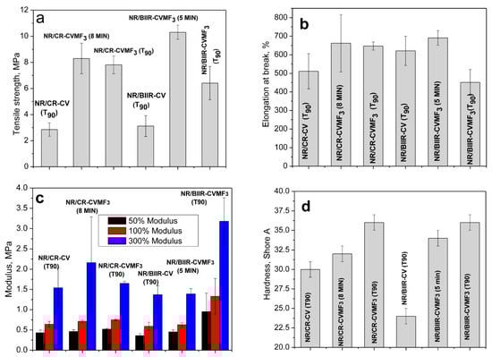 Depicted in Figure 9a–d are the mechanical properties such as the tensile strength (TS), elongation at break (EB), modulus at different percentage elongations and the shore-A hardness of NR/CR-CV, NR/CR-CVMF3, NR/BIIR-CV and NR/BIIR-CVMF3 molded at 170 °C as per their T90. NR/CR-CV shows a tensile strength of 2.85 MPa with a breaking elongation of 511%. However, the TS of NR/CR-CVMF3 was 174% higher than NR/CR-CV. Moreover, both the EB and modulus at different percentage elongations of NR/CR-CVMF3 were also considerably higher than NR/CR-CV. Similarly, the TS of NR/BIIR-CVMF3 was 107% higher than the corresponding NR/BIIR-CV. The modulus of NR/BIIR-CVMF3 at different percentage elongations were also significantly higher than NR/BIIR-CV. The hardness of the blends cured with CV and CVMF3 is represented in Figure 9d. The knowledge of the hardness of a rubber material is very essential, particularly when it is used in seals and gaskets. For sealing applications, the rubber compounds should be soft enough for better sealing ability, yet hard enough to sustain the loading force. Generally, rubbers with a tightly cross-linked network structure exhibit a high resistance to indentation. From Figure 9d, it is clear that the hardness of both the NR/CR-CVMF3 and NR/BIIR-CV MF3 were significantly improved compared to their respective NR/CR-CV and NR/BIIR-CV.